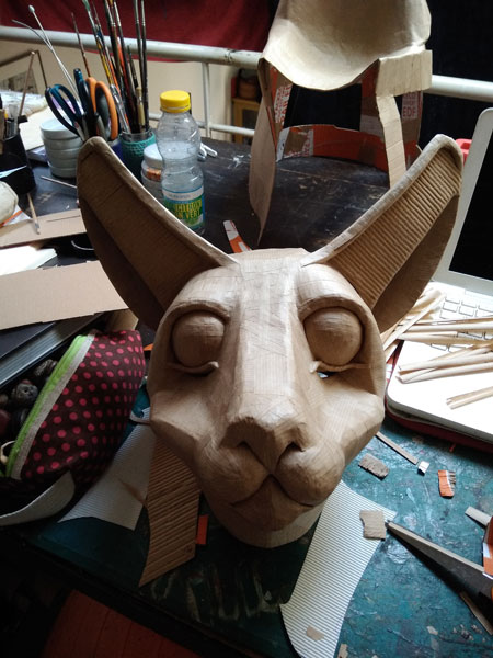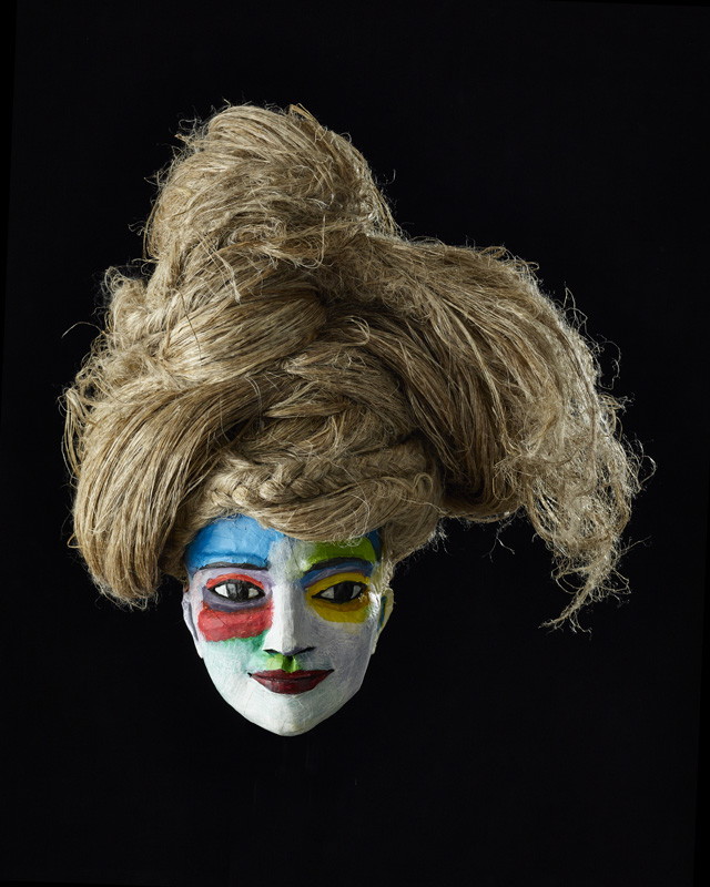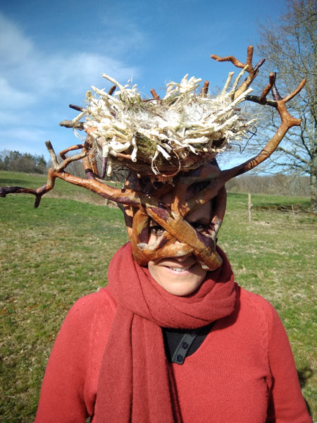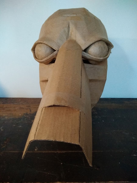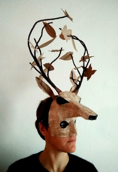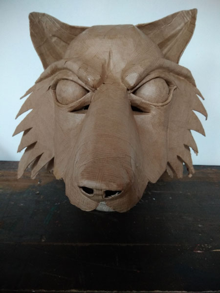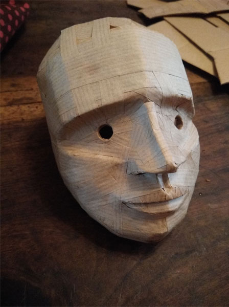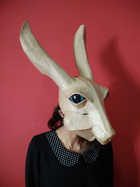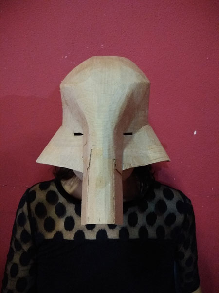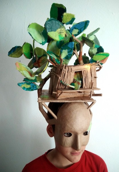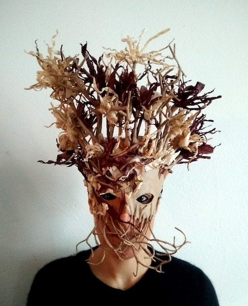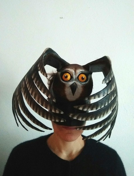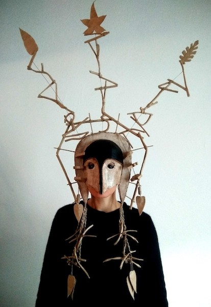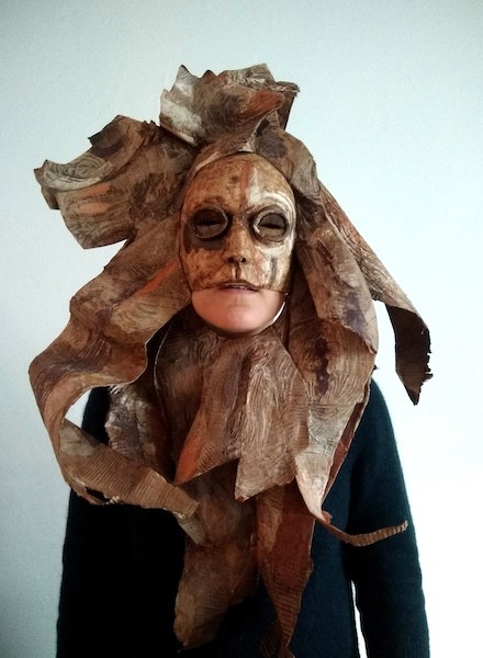 Masques réalisés pour le théâtre et pour mon modèle. Carton, papier, ficelle, acrylique, fil de fer.