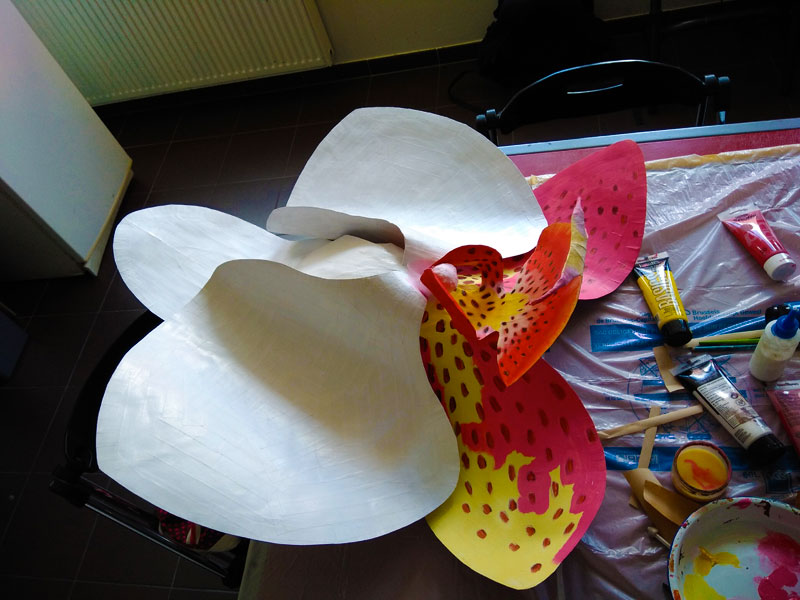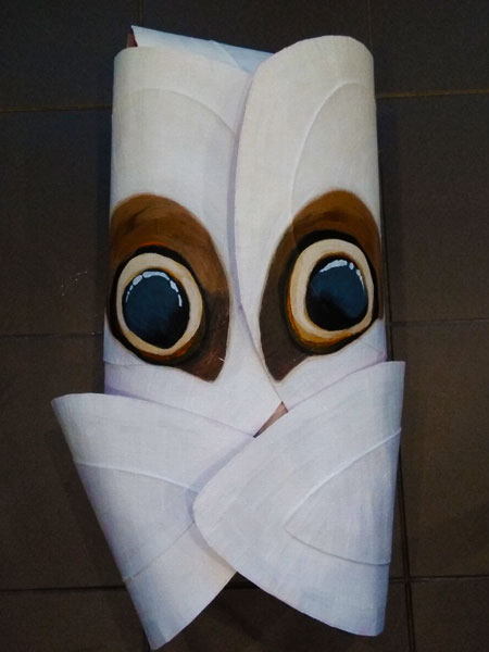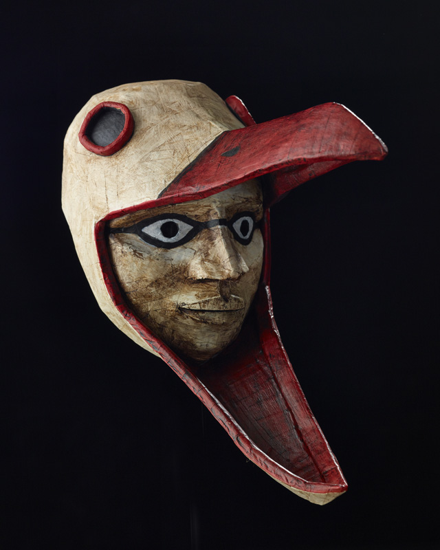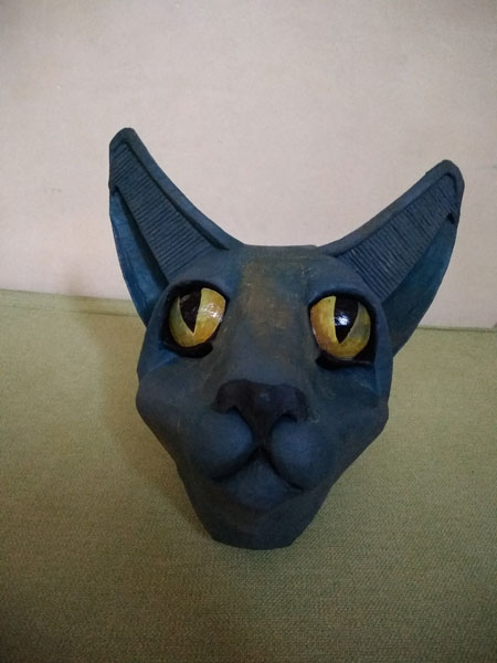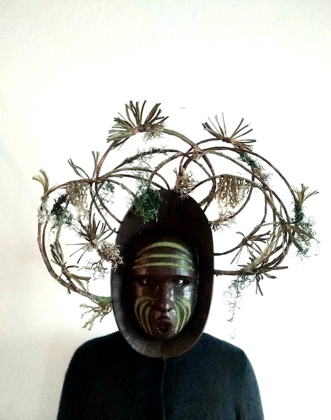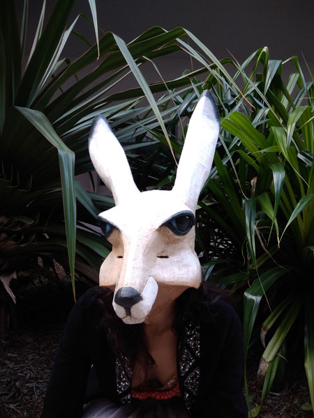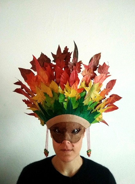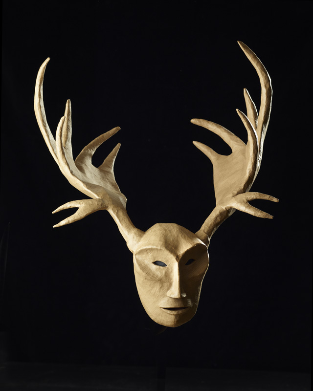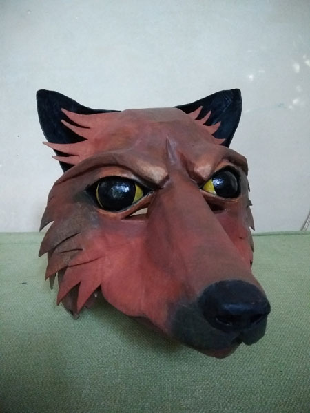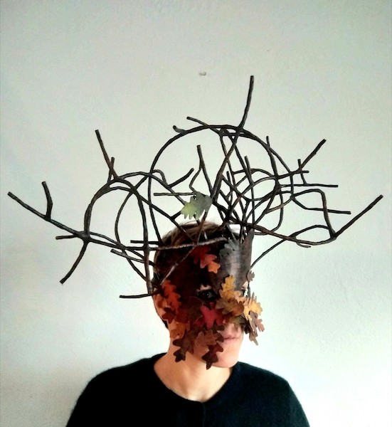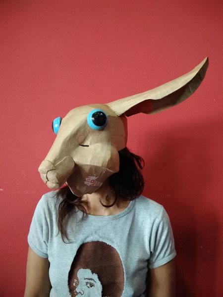 Masques réalisés pour le théâtre et pour mon modèle. Carton, papier, ficelle, acrylique, fil de fer.